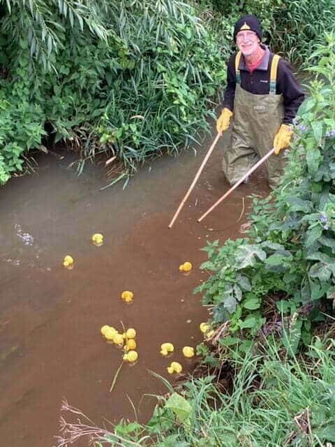 People were very busy buying ducks and at one point I was worried we might run out. Two buckets full of ducks were carried to the start point (halfway between the 2 bridges) and thrown into the river. For the first time it was not me, but Rick Stokes (waring his ‘professional’ waders) who harried the slower ducks downstream over the slower part of the course where there was much pondweed.